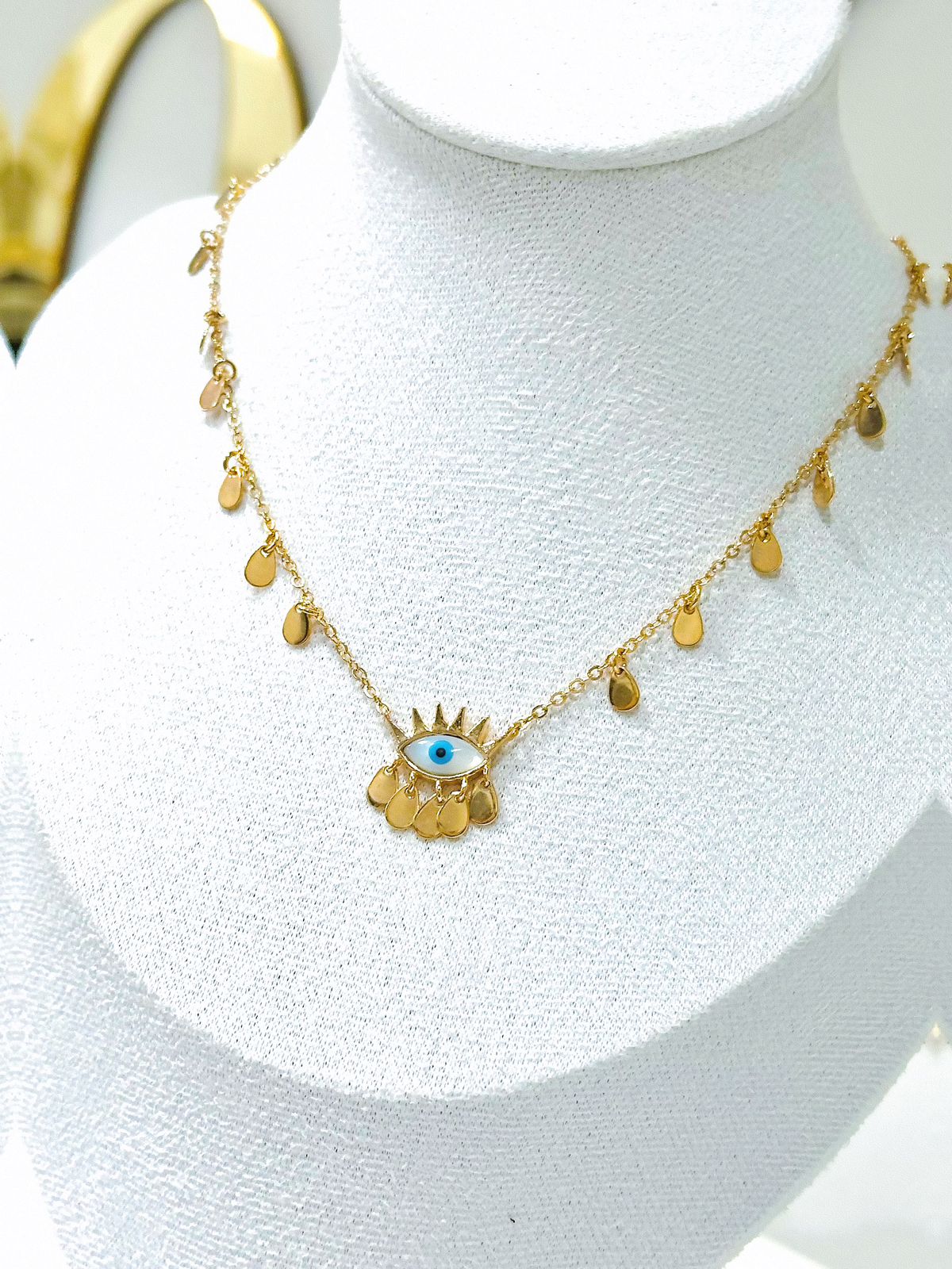 Colar olho grego madreperola e medalhas lisas. Uma peça linda e rica em detalhes para quem gosta de acessórios diferenciados e que encantam à primeira vista!