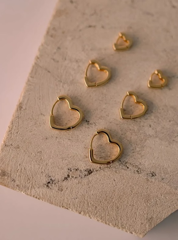 Um trio de argolas em formato de coração liso, banhado a ouro, que possui um ano de garantia e é antialérgico, é uma opção encantadora e segura para adicionar um toque romântico e elegante ao seu visual.
